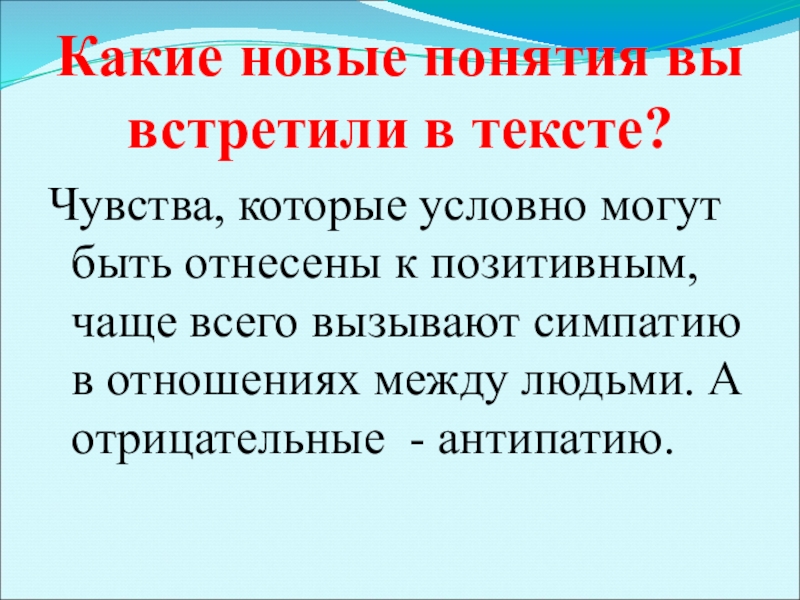 Какие новые понятия вы встретили в тексте? Чувства, которые условно могут быть отнесены к позитивным, чаще всего