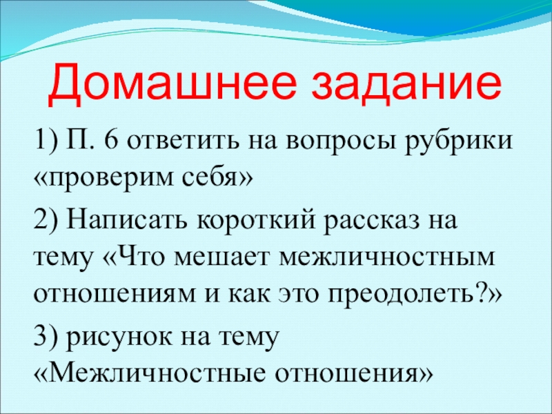 Домашнее задание1) П. 6 ответить на вопросы рубрики «проверим себя»2) Написать короткий рассказ на тему «Что мешает