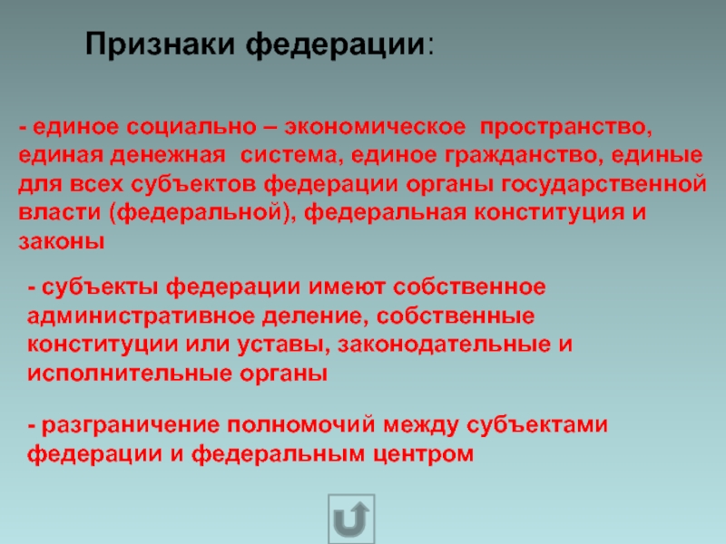 - территория делится на административно – территориальные единицы , не обладающие признаками суверенитета