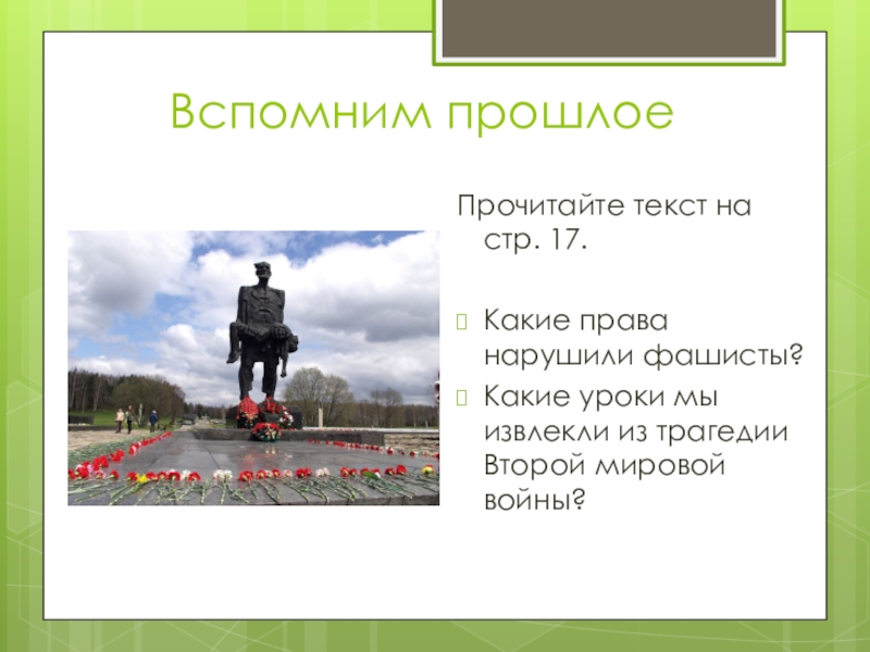 Вспомним прошлоеПрочитайте текст на стр. 17.Какие права нарушили фашисты?Какие уроки мы извлекли из трагедии Второй мировой войны?