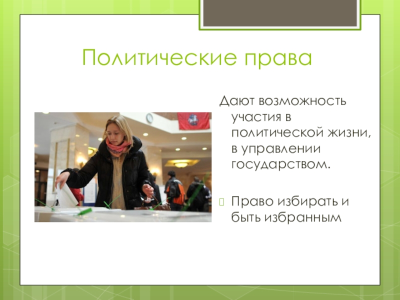 Политические праваДают возможность участия в политической жизни, в управлении государством.Право избирать и быть избранным