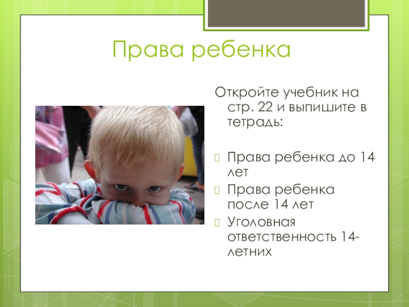 Права ребенкаОткройте учебник на стр. 22 и выпишите в тетрадь:Права ребенка до 14 летПрава ребенка после 14