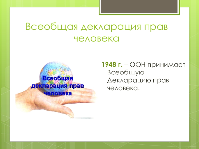 Всеобщая декларация прав человека1948 г. – ООН принимает Всеобщую Декларацию прав человека.