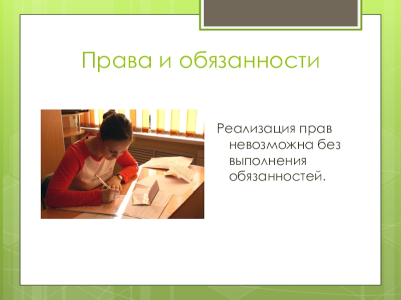 Права и обязанностиРеализация прав невозможна без выполнения обязанностей.