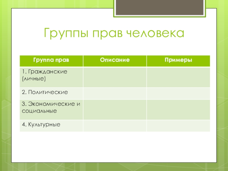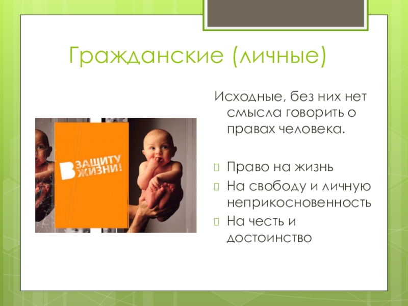 Гражданские (личные)Исходные, без них нет смысла говорить о правах человека.Право на жизньНа свободу и личную неприкосновенностьНа честь