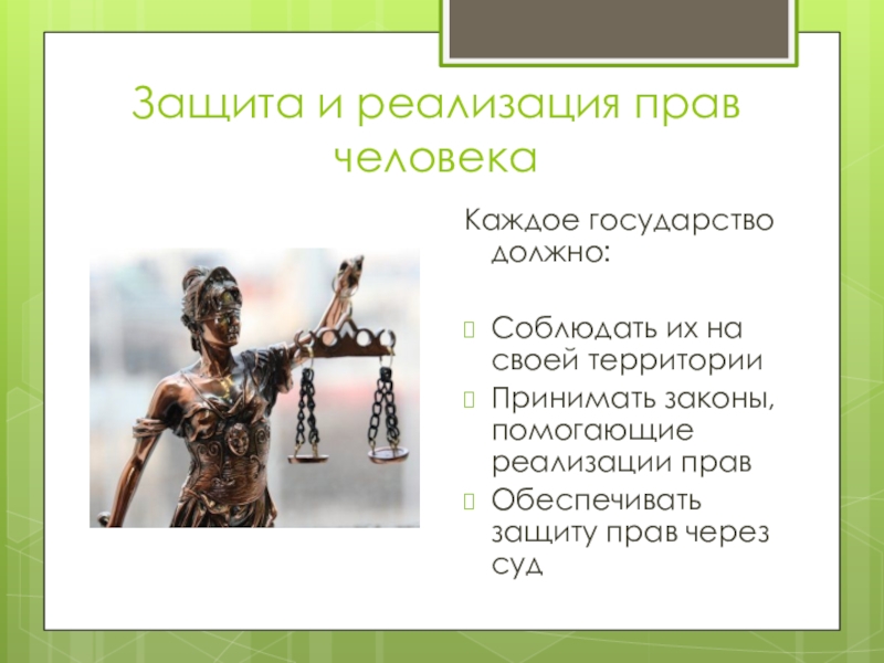 Защита и реализация прав человекаКаждое государство должно:Соблюдать их на своей территорииПринимать законы, помогающие реализации правОбеспечивать защиту прав