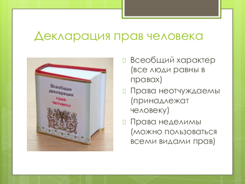 Декларация прав человекаВсеобщий характер (все люди равны в правах)Права неотчуждаемы (принадлежат человеку)Права неделимы (можно пользоваться всеми видами