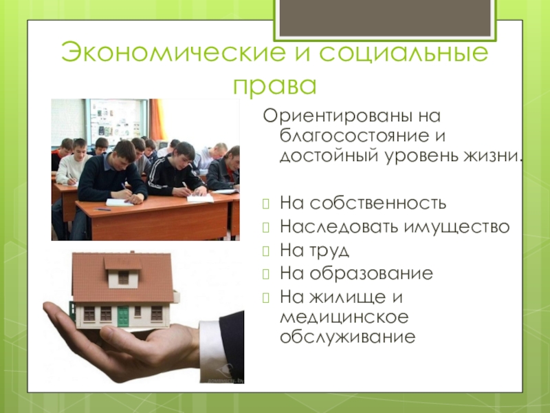 Экономические и социальные праваОриентированы на благосостояние и достойный уровень жизни.На собственностьНаследовать имуществоНа трудНа образованиеНа жилище и медицинское