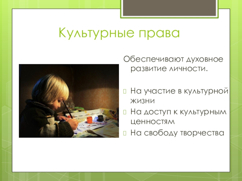 Культурные праваОбеспечивают духовное развитие личности.На участие в культурной жизниНа доступ к культурным ценностямНа свободу творчества