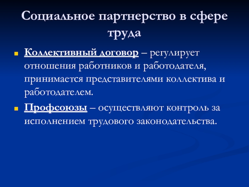 Социальное партнерство в сфере трудаКоллективный договор – регулирует отношения работников и работодателя, принимается представителями коллектива и работодателем.