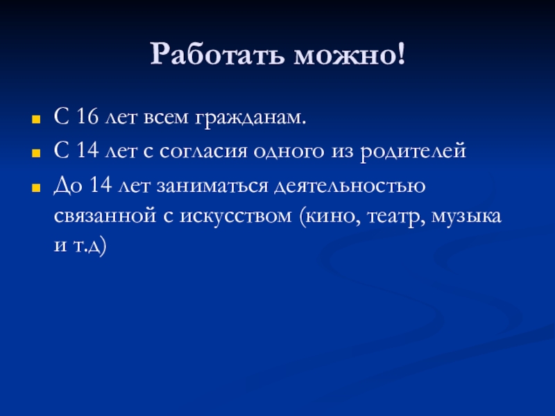 До 14 лет заниматься деятельностью связанной с искусством (кино, театр, музыка и т.д)