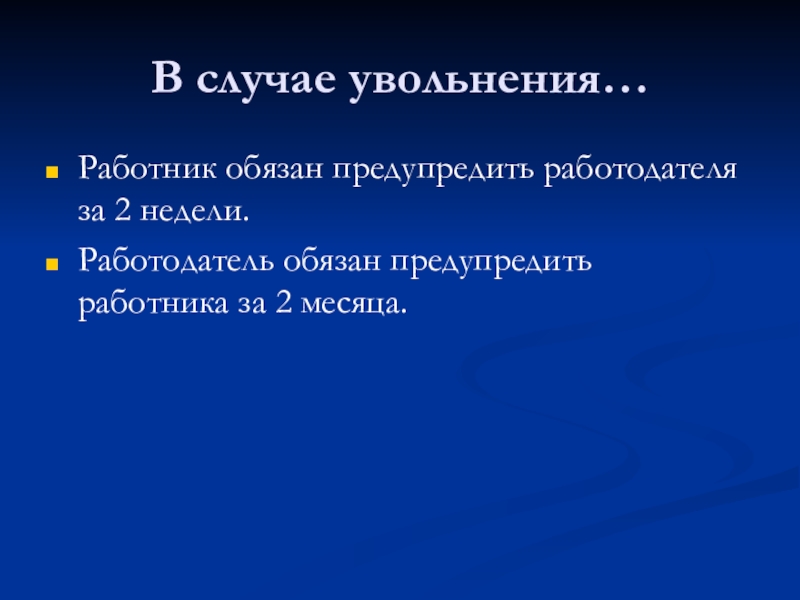 В случае увольнения…Работник обязан предупредить работодателя за 2 недели.Работодатель обязан предупредить работника за 2 месяца.