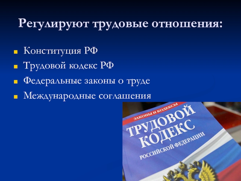 Регулируют трудовые отношения:Конституция РФТрудовой кодекс РФФедеральные законы о трудеМеждународные соглашения