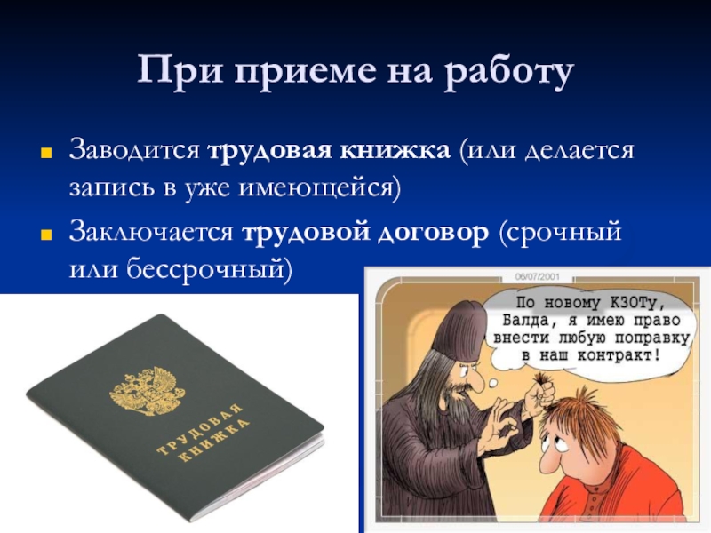 При приеме на работу Заводится трудовая книжка (или делается запись в уже имеющейся)Заключается трудовой договор (срочный или