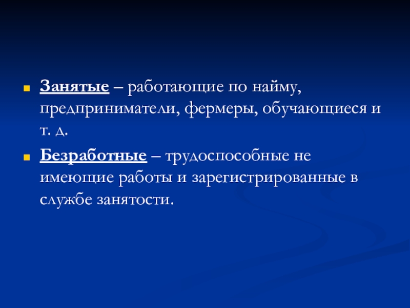 Занятые – работающие по найму, предприниматели, фермеры, обучающиеся и т. д.Безработные – трудоспособные не имеющие работы и