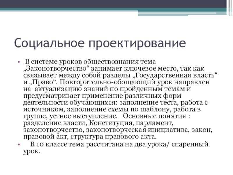 Социальное проектирование В системе уроков обществознания тема „Законотворчество“ занимает ключевое место, так как связывает между собой разделы „Государственная власть“ и „Право“. Повторительно-обощающий урок направлен на актуализацию знаний по пройденным темам и предусматривает применение различных форм деятельности