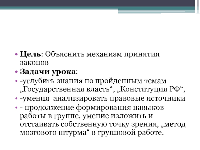 Цель: Объяснить механизм принятия законов Задачи урока: -углубить знания по пройденным темам „Государственная власть“, „Конституция РФ“,