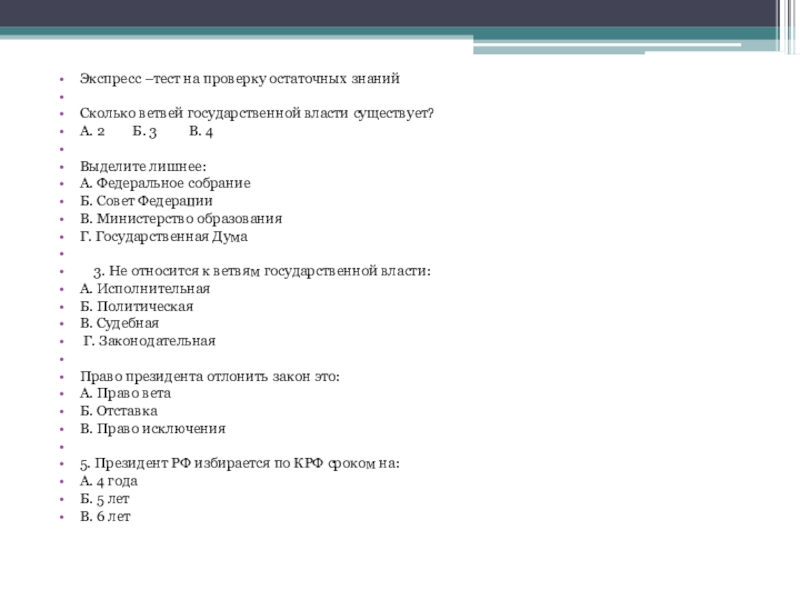 Экспресс –тест на проверку остаточных знаний Сколько ветвей государственной власти существует?А. 2    Б. 3
