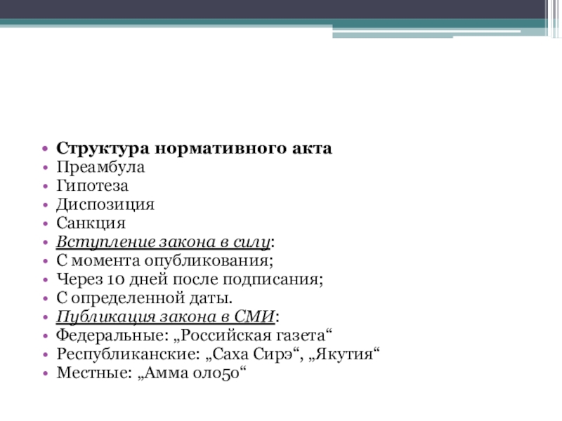 Структура нормативного актаПреамбула ГипотезаДиспозицияСанкция Вступление закона в силу: С момента опубликования;Через 10 дней после подписания;С определенной даты.Публикация