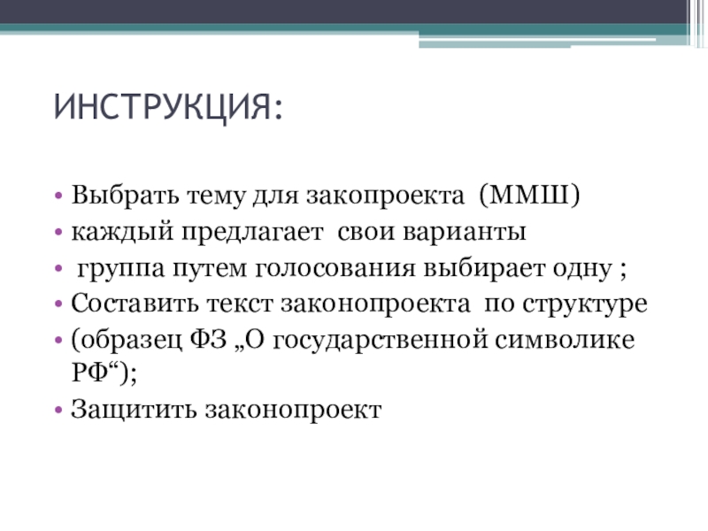 ИНСТРУКЦИЯ:  Выбрать тему для закопроекта (ММШ)каждый предлагает свои варианты группа путем голосования выбирает одну ;Составить
