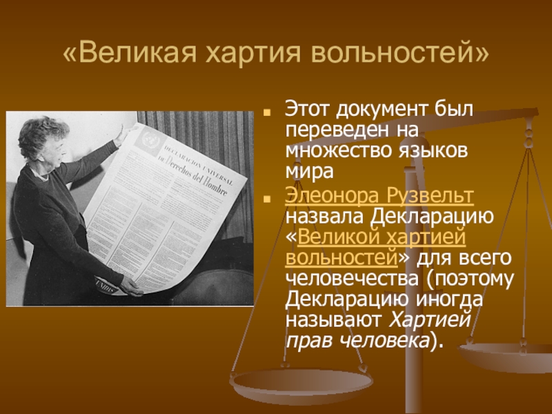Рузвельт назвала Декларацию «Великой хартией вольностей» для всего человечества (поэтому Декларацию иногда называют Хартией прав человека).