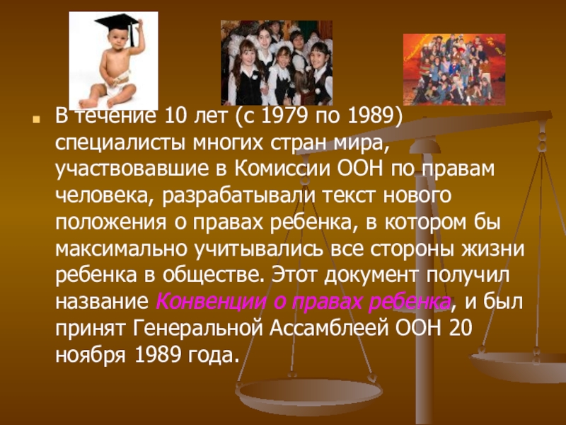 мира, участвовавшие в Комиссии ООН по правам человека, разрабатывали текст нового положения о правах ребенка, в котором бы максимально учитывались все стороны жизни ребенка в обществе. Этот документ получил название Конвенции о правах ребенка, и был принят Генеральной Ассамблеей ООН 20 ноября 1989 года.
