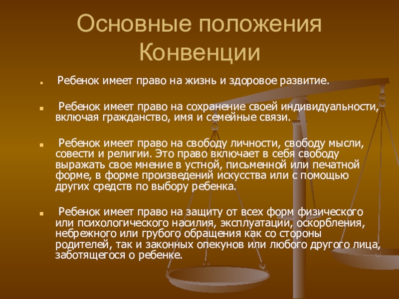 Ребенок имеет право на защиту от всех форм физического или психологического насилия, эксплуатации, оскорбления, небрежного или грубого обращения как со стороны родителей, так и законных опекунов или любого другого лица, заботящегося о ребенке.