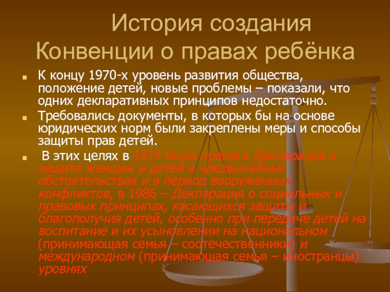 В этих целях в 1974 была принята Декларация о защите женщин и детей в чрезвычайных обстоятельствах и в период вооруженных конфликтов, в 1986 – Декларация о социальных и правовых принципах, касающихся защиты и благополучия детей, особенно при передаче детей на воспитание и их усыновлении на национальном (принимающая семья – соотечественники) и международном (принимающая семья – иностранцы) уровнях