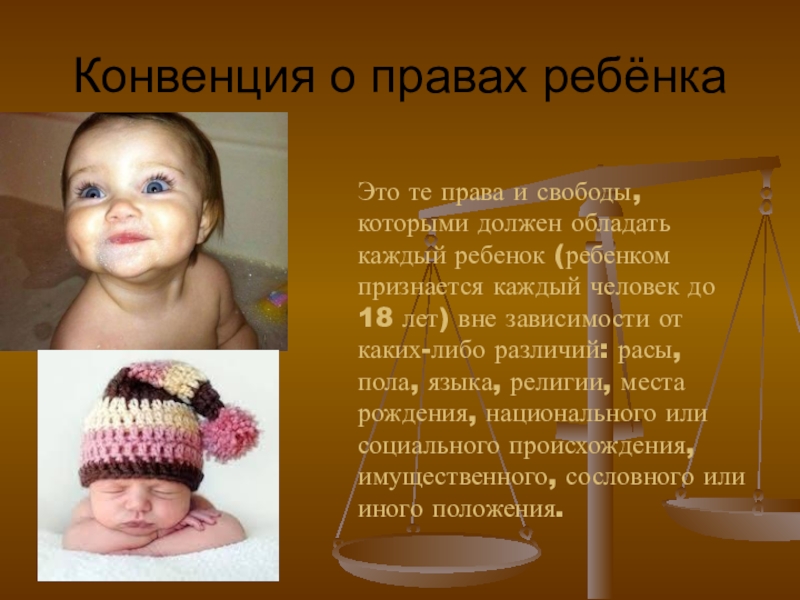 каждый ребенок (ребенком признается каждый человек до 18 лет) вне зависимости от каких-либо различий: расы, пола, языка, религии, места рождения, национального или социального происхождения, имущественного, сословного или иного положения.