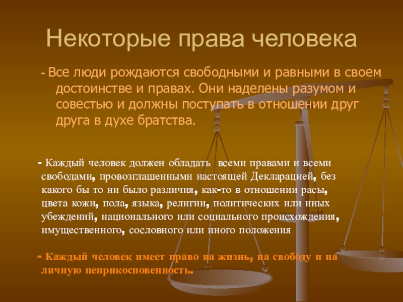 Каждый человек должен обладать всеми правами и всеми свободами, провозглашенными настоящей Декларацией, без какого бы то ни было различия, как-то в отношении расы, цвета кожи, пола, языка, религии, политических или иных убеждений, национального или социального происхождения, имущественного, сословного или иного положения