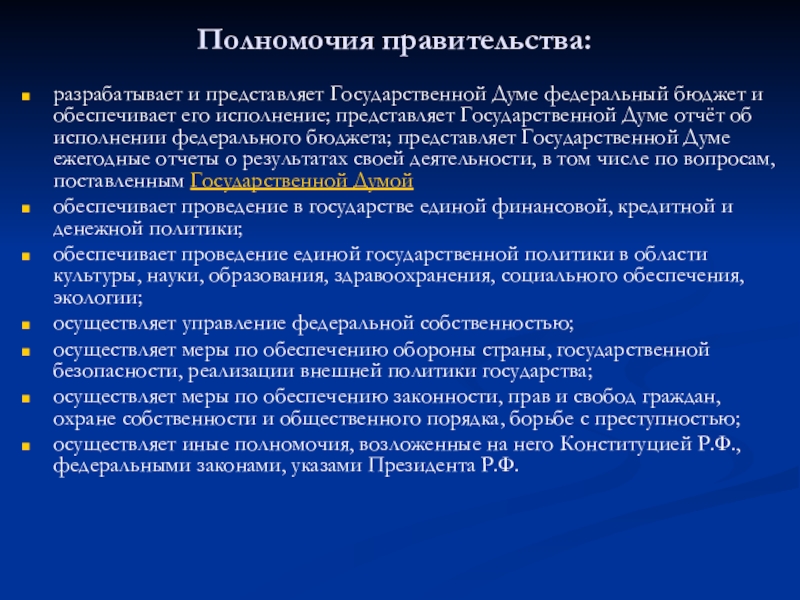 исполнение; представляет Государственной Думе отчёт об исполнении федерального бюджета; представляет Государственной Думе ежегодные отчеты о результатах своей деятельности, в том числе по вопросам, поставленным Государственной Думой