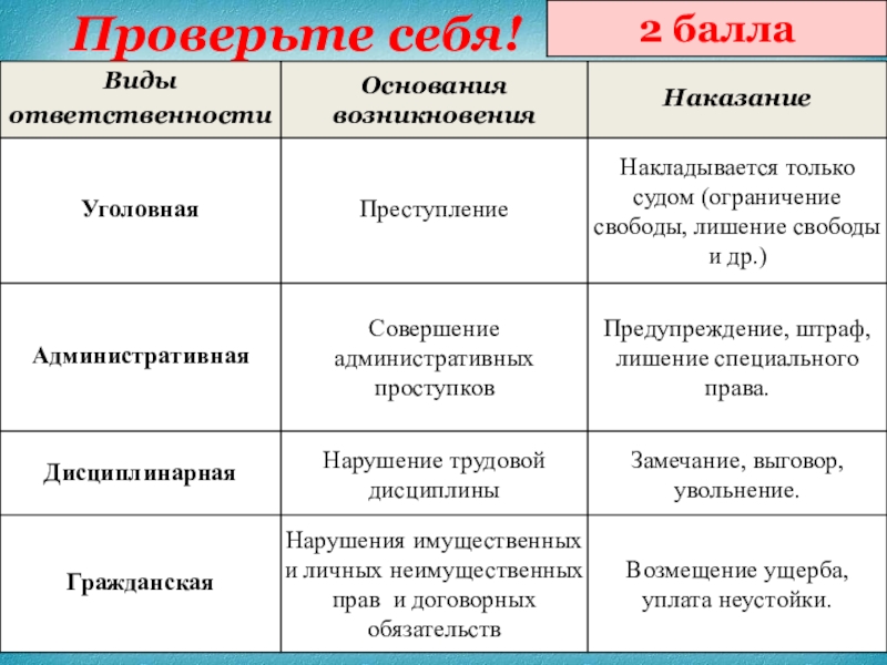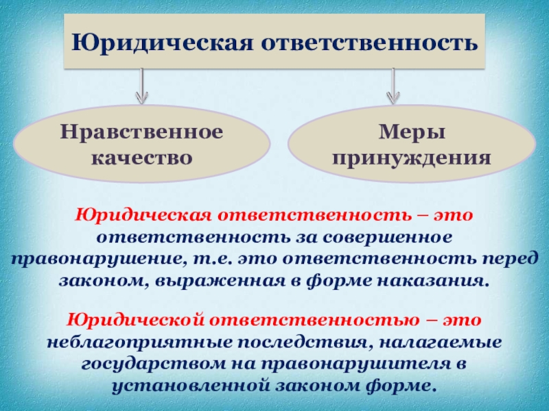 Юридической ответственностью – это неблагоприятные последствия, налагаемые государством на правонарушителя в установленной законом форме.