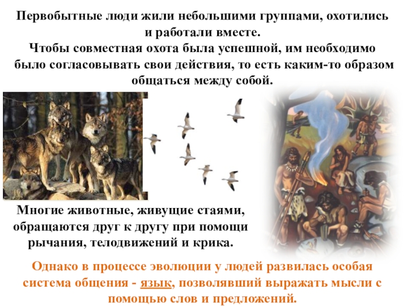 Чтобы совместная охота была успешной, им необходимо было согласовывать свои действия, то есть каким-то образом общаться между собой.