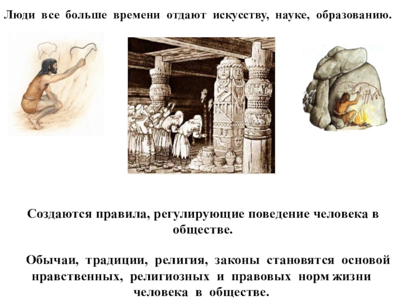 Первобытные люди жили небольшими группами, охотились и работали вместе.