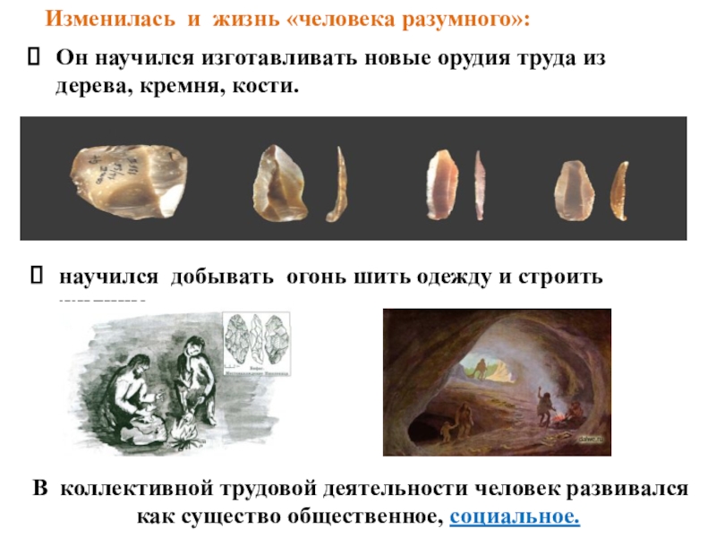 Он научился изготавливать новые орудия труда из дерева, кремня, кости.