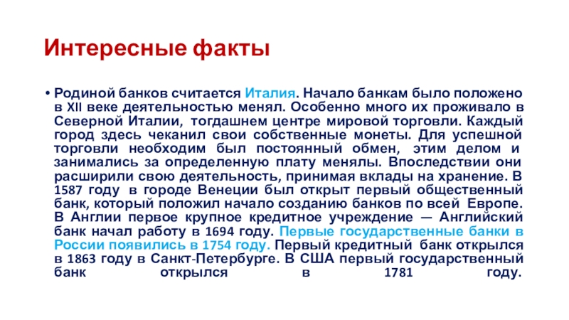 деятельностью менял. Особенно много их проживало в Северной Италии, тогдашнем центре мировой торговли. Каждый город здесь чеканил свои собственные монеты. Для успешной торговли необходим был постоянный обмен, этим делом и занимались за определенную плату менялы. Впоследствии они расширили свою деятельность, принимая вклады на хранение. В 1587 году в городе Венеции был открыт первый общественный банк, который положил начало созданию банков по всей Европе. В Англии первое крупное кредитное учреждение — Английский банк начал работу в 1694 году. Первые государственные банки в России появились в 1754 году. Первый кредитный банк открылся в 1863 году в Санкт-Петербурге. В США первый государственный банк открылся в 1781 году.