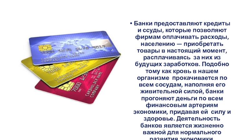 Слайд 13Банки предоставляют кредиты и ссуды, которые позволяют фирмам оплачивать расходы, населению