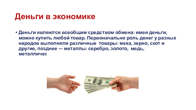 Слайд 10С помощью денег можно измерить рыночную стоимость различных товаров и услуг