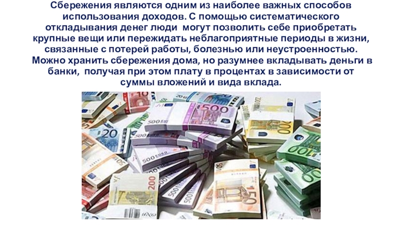 Слайд 11Сбережения являются одним из наиболее важных способов использования доходов. С помощью