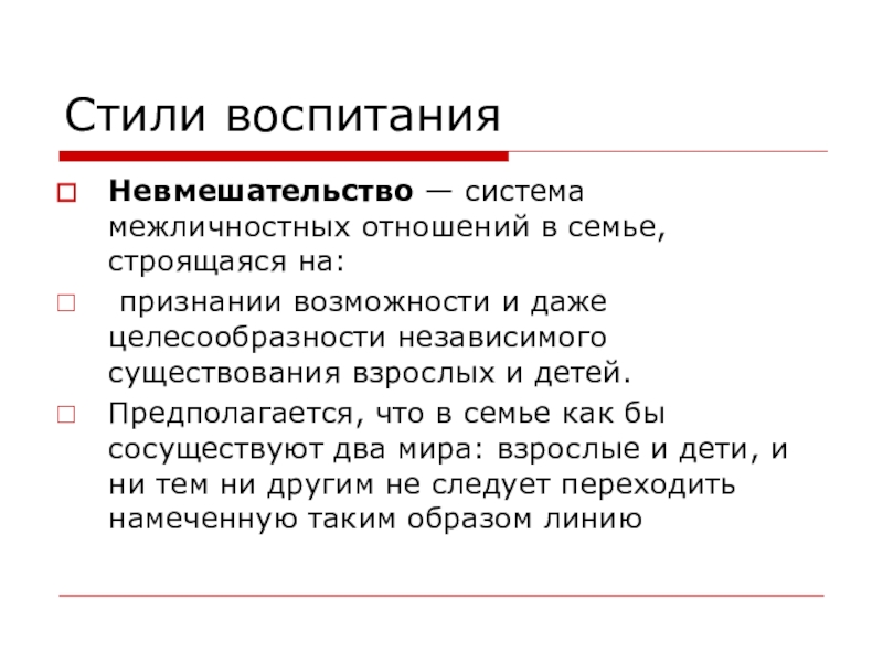 Предполагается, что в семье как бы сосуществуют два мира: взрослые и дети, и ни тем ни другим не следует переходить намеченную таким образом линию