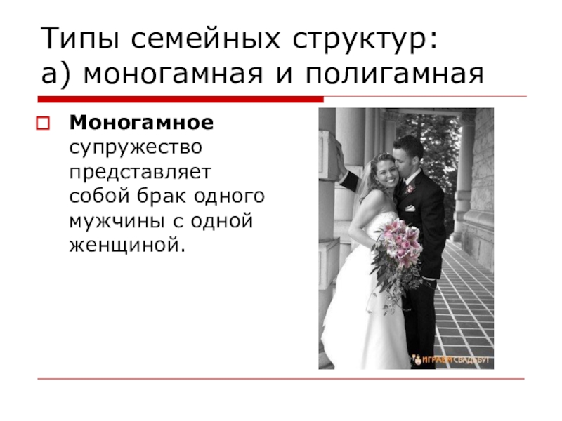 несколькими женщинами. Полигамия бывает двух видов: полигиния — брак одного мужчины с несколькими женщинами и полиандрия — брак одной женщины с несколькими мужчинами;