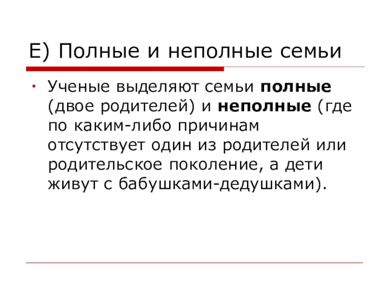 неполные (где по каким-либо причинам отсутствует один из родителей или родительское поколение, а дети живут с бабушками-дедушками).