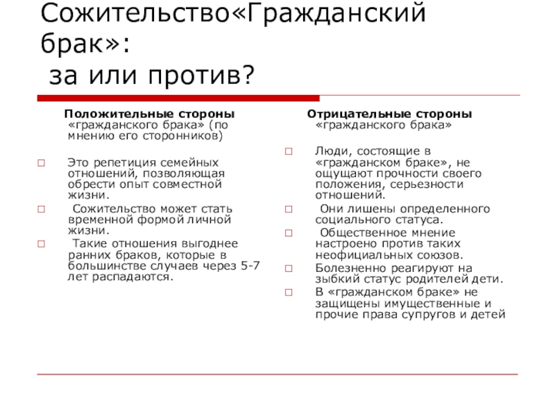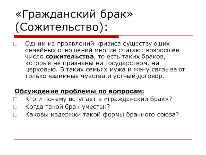 возросшее число сожительства, то есть таких браков, которые не признаны ни государством, ни церковью. В таких семьях мужа и жену связывают только взаимные чувства и устный договор.
