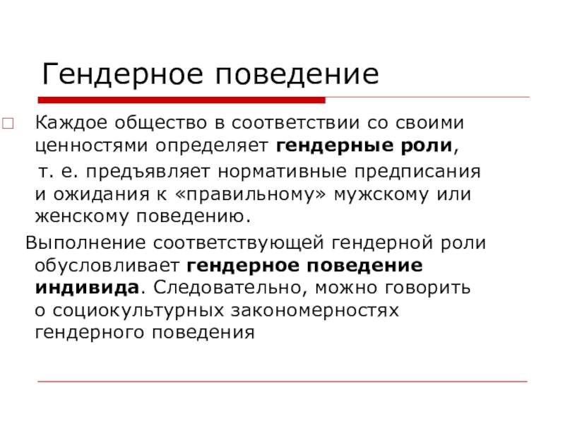 Выполнение соответствующей гендерной роли обусловливает гендерное поведение индивида. Следовательно, можно говорить о социокультурных закономерностях гендерного поведения