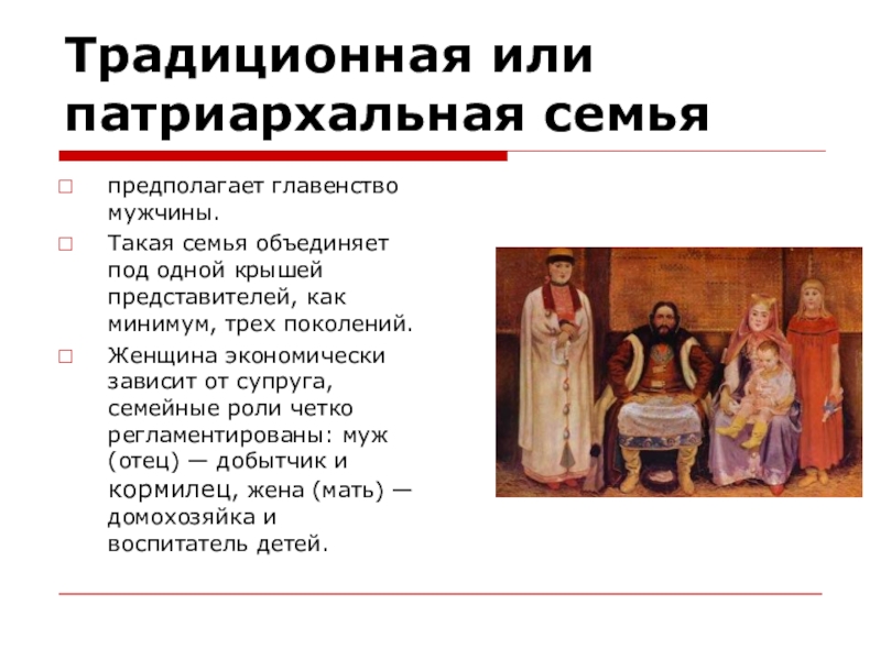 Женщина экономически зависит от супруга, семейные роли четко регламентированы: муж (отец) — добытчик и кормилец, жена (мать) — домохозяйка и воспитатель детей.
