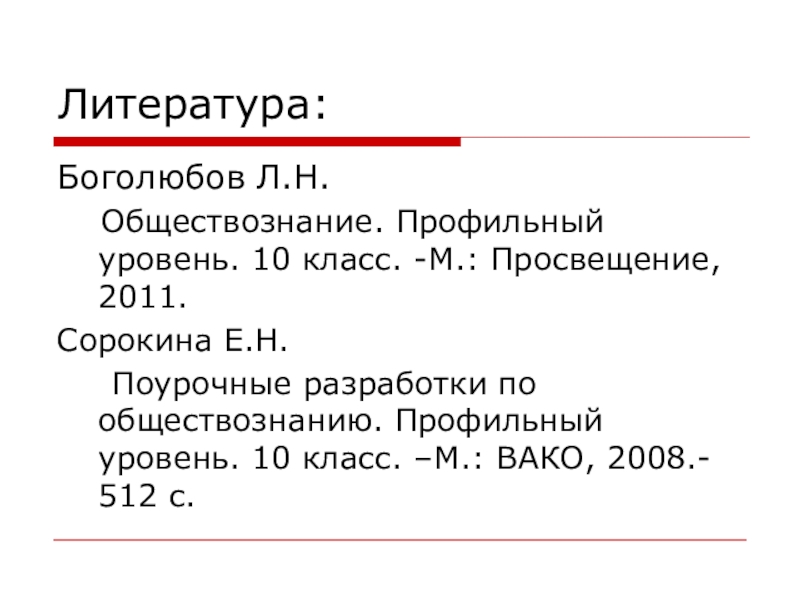 Обществознание. Профильный уровень. 10 класс. -М.: Просвещение, 2011.