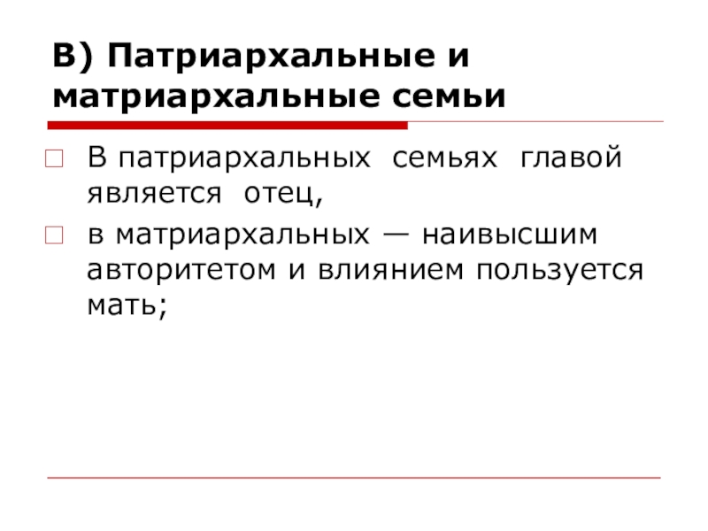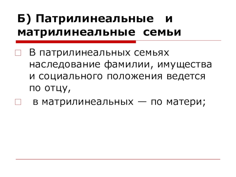 Слайд 9Б) Патрилинеальные и матрилинеальные семьи