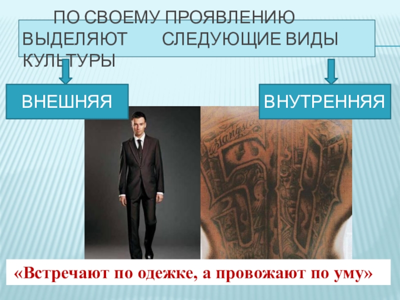 По своему проявлению выделяют  	   следующие виды культуры ВНУТРЕННЯЯВНЕШНЯЯ «Встречают