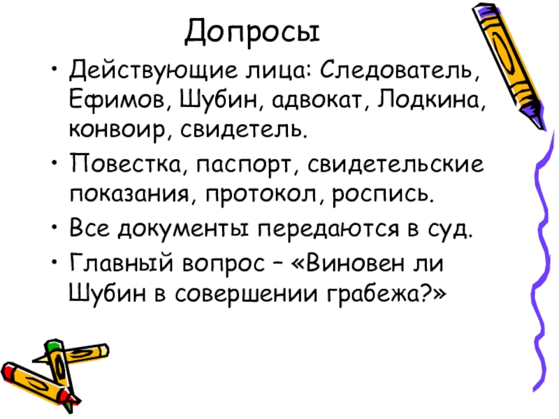 ДопросыДействующие лица: Следователь, Ефимов, Шубин, адвокат, Лодкина, конвоир, свидетель.Повестка, паспорт, свидетельские показания, протокол, роспись.Все документы передаются в
