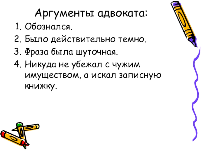 Аргументы адвоката:Обознался.Было действительно темно.Фраза была шуточная.Никуда не убежал с чужим имуществом, а искал записную книжку.